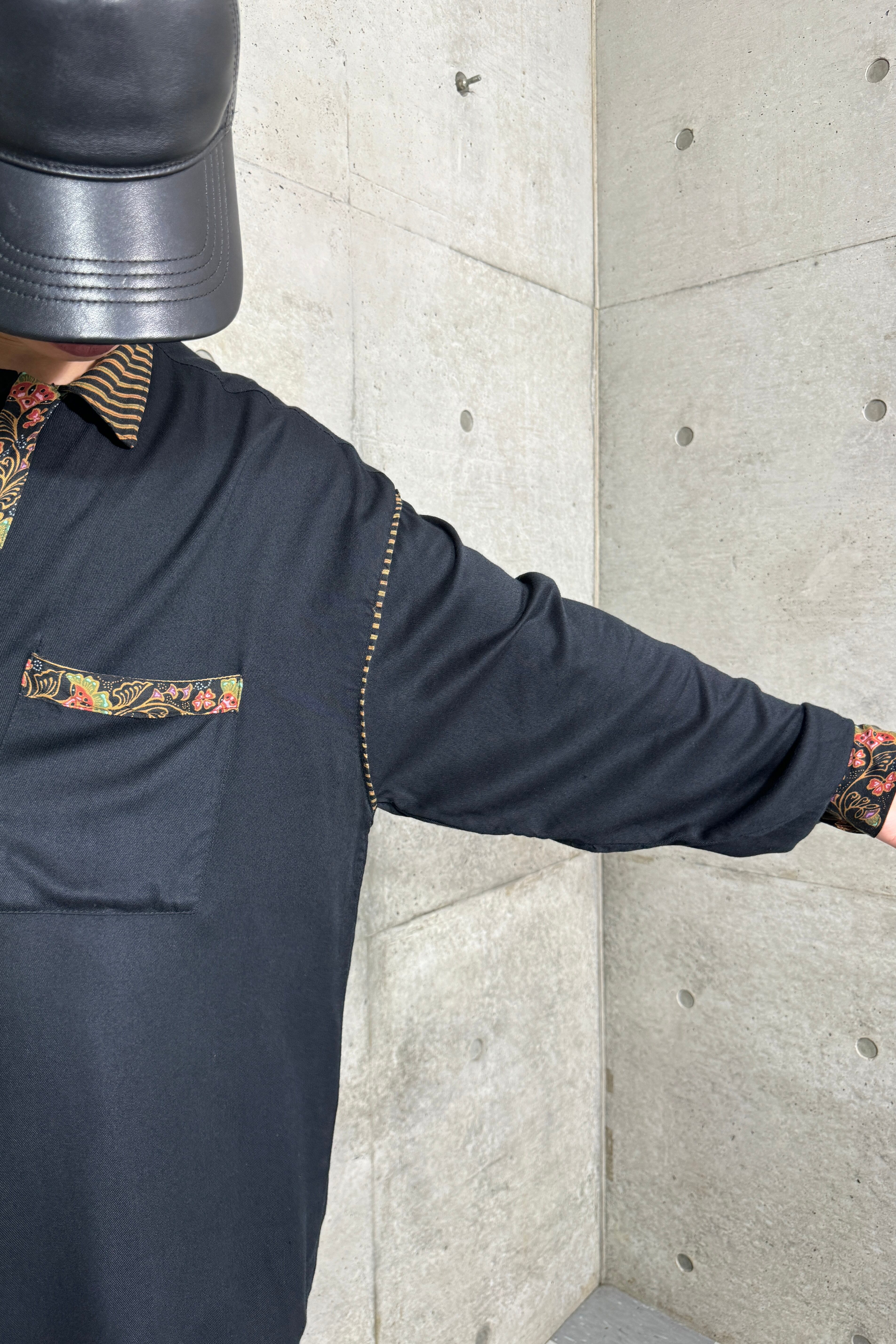 花柄・ボーダーの切替が面白いブラックボディーのレーヨン、古着において黒のアイテムは見つけるのがあまり無くさらにはこのデザイン製.....サイズ感もゆったりとしたシルエットで1番素材感の良さが出るサイズ感です。