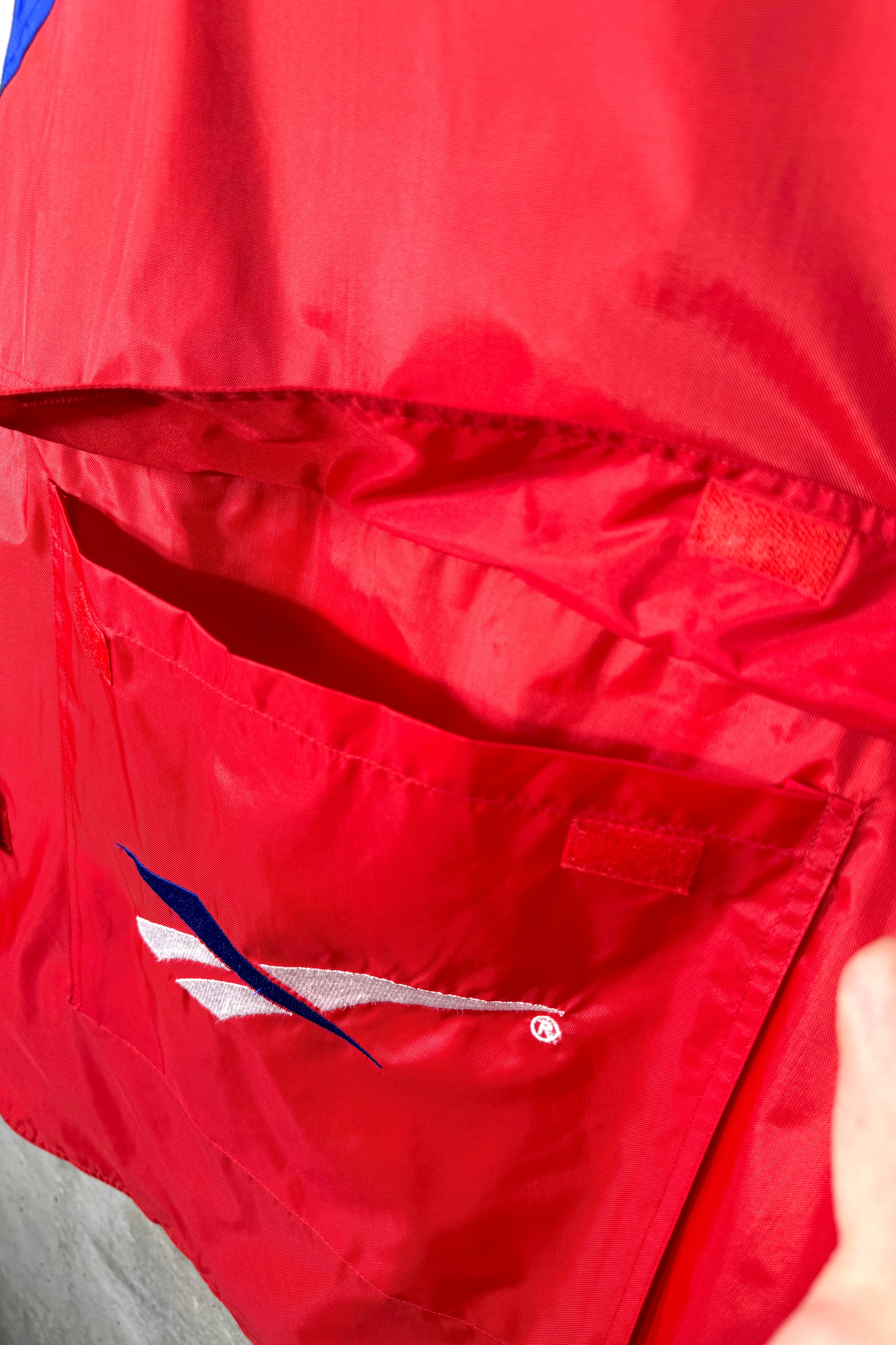赤×青の参考にしたい見事な色合いに多くのポケットが付いたデザイン製のあるベスト