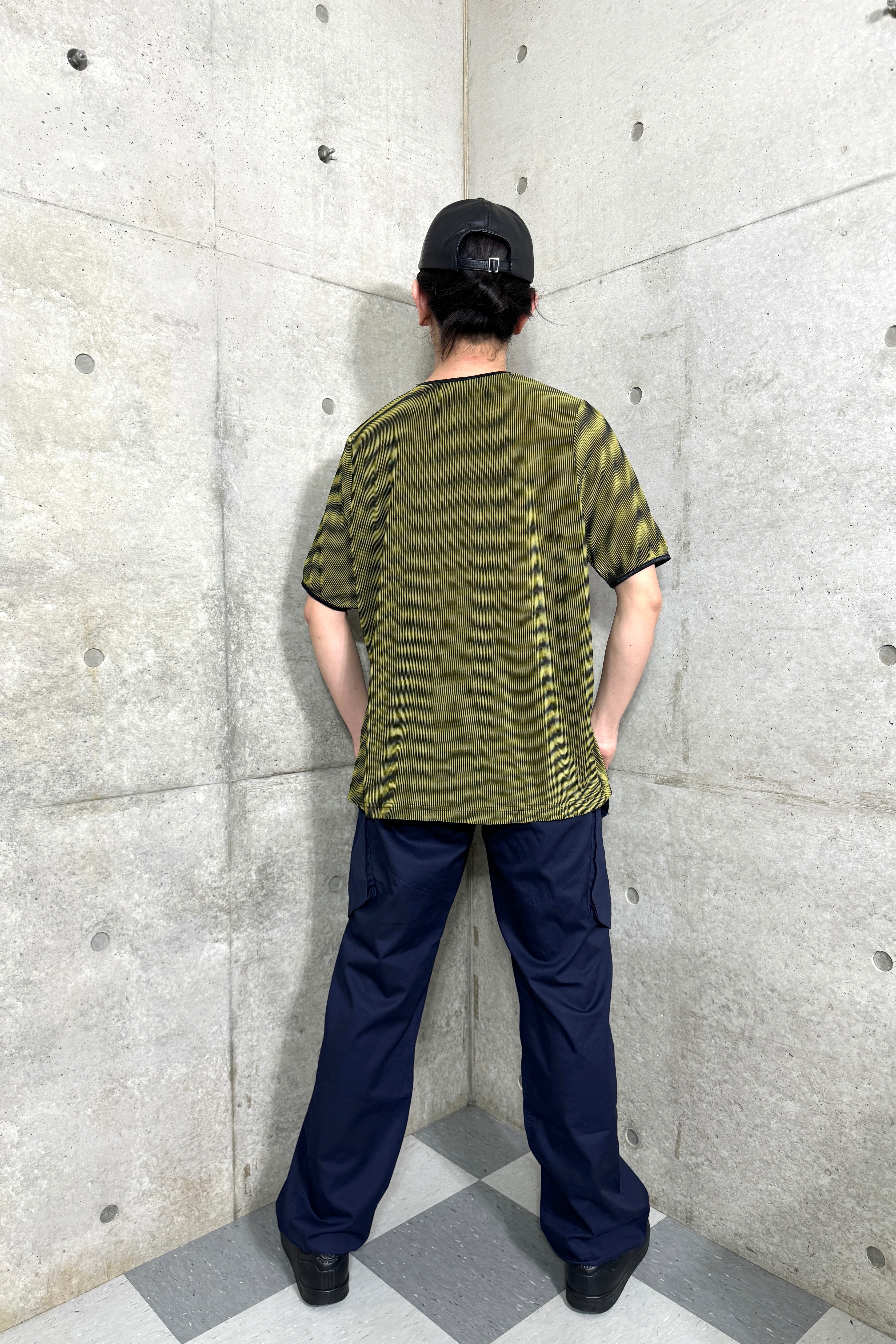 シャリ感ある素材感に入った独特な模様のカットソー、縦に入ったプリーツによってモザイクのような見え方をする面白いデザイン