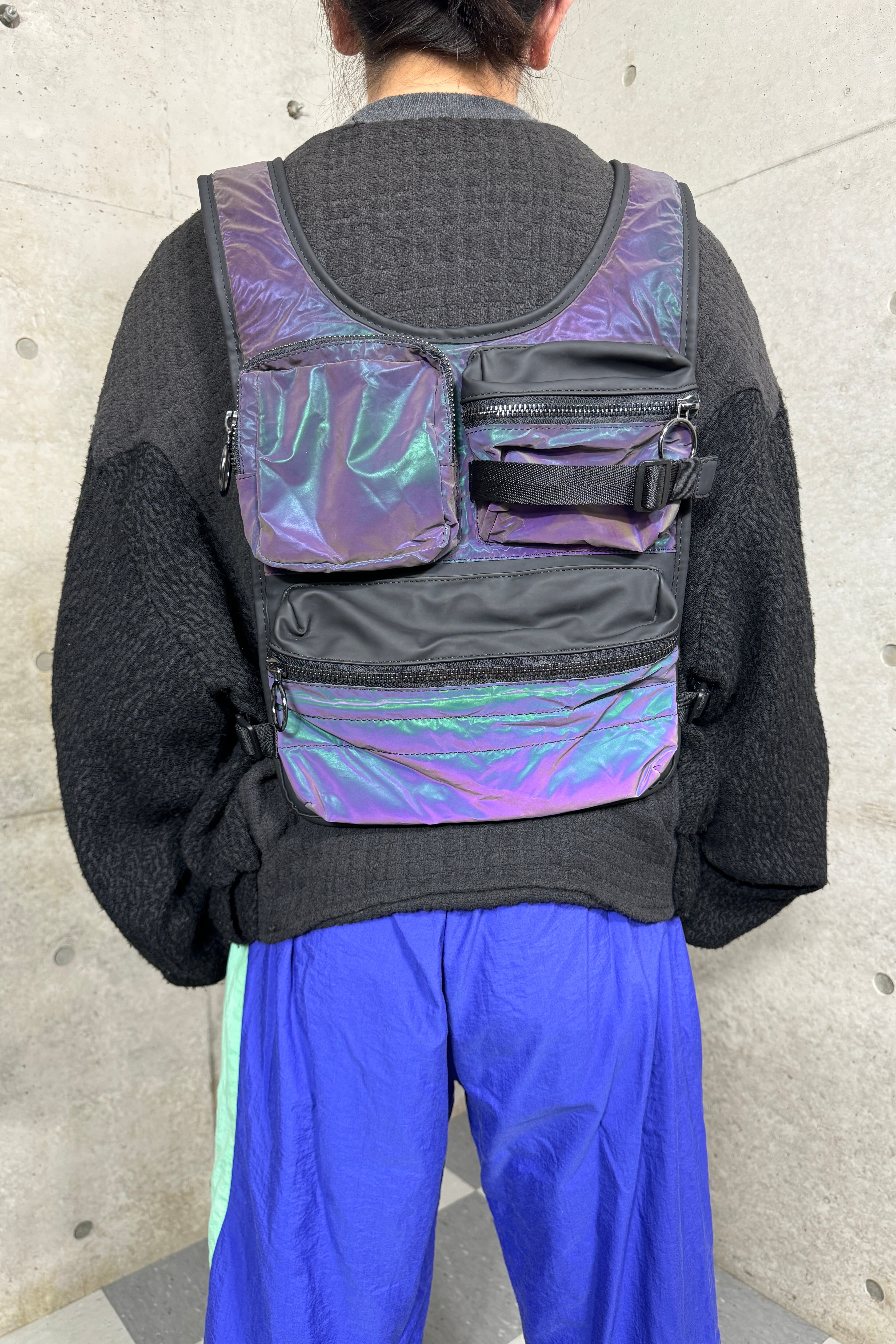 紫がかったダークな光沢にいくつものポケットが取り付けられたボディーバッグ。