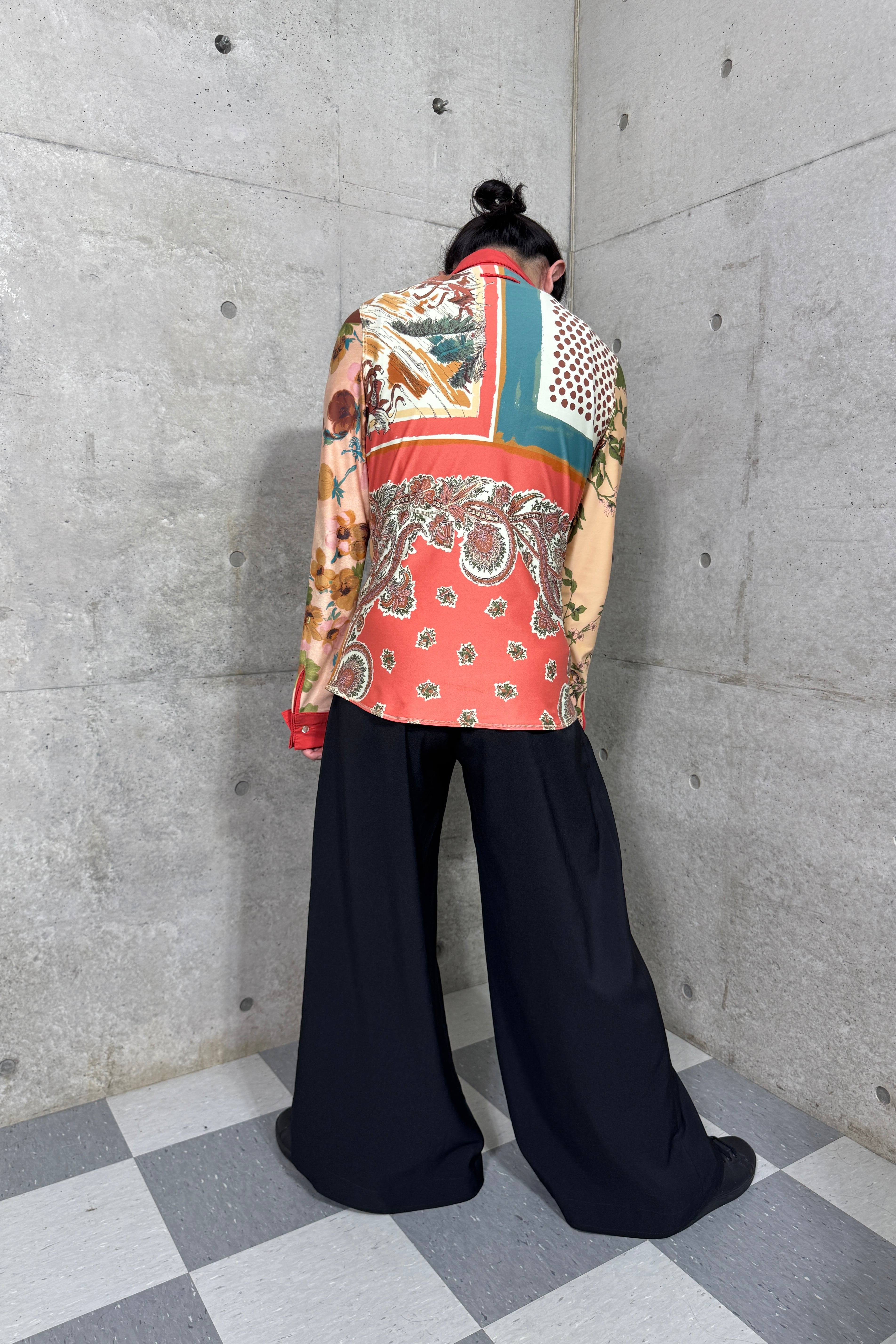 70sポリシャツをイメージしたであろうゴルチエオムの総柄シャツ。通常のポリシャツにはみられない襟の切替・ダブルカフスとゴルチエらしいゴージャスな中にある上品なイメージが合わさった素晴らしいシャツになります。