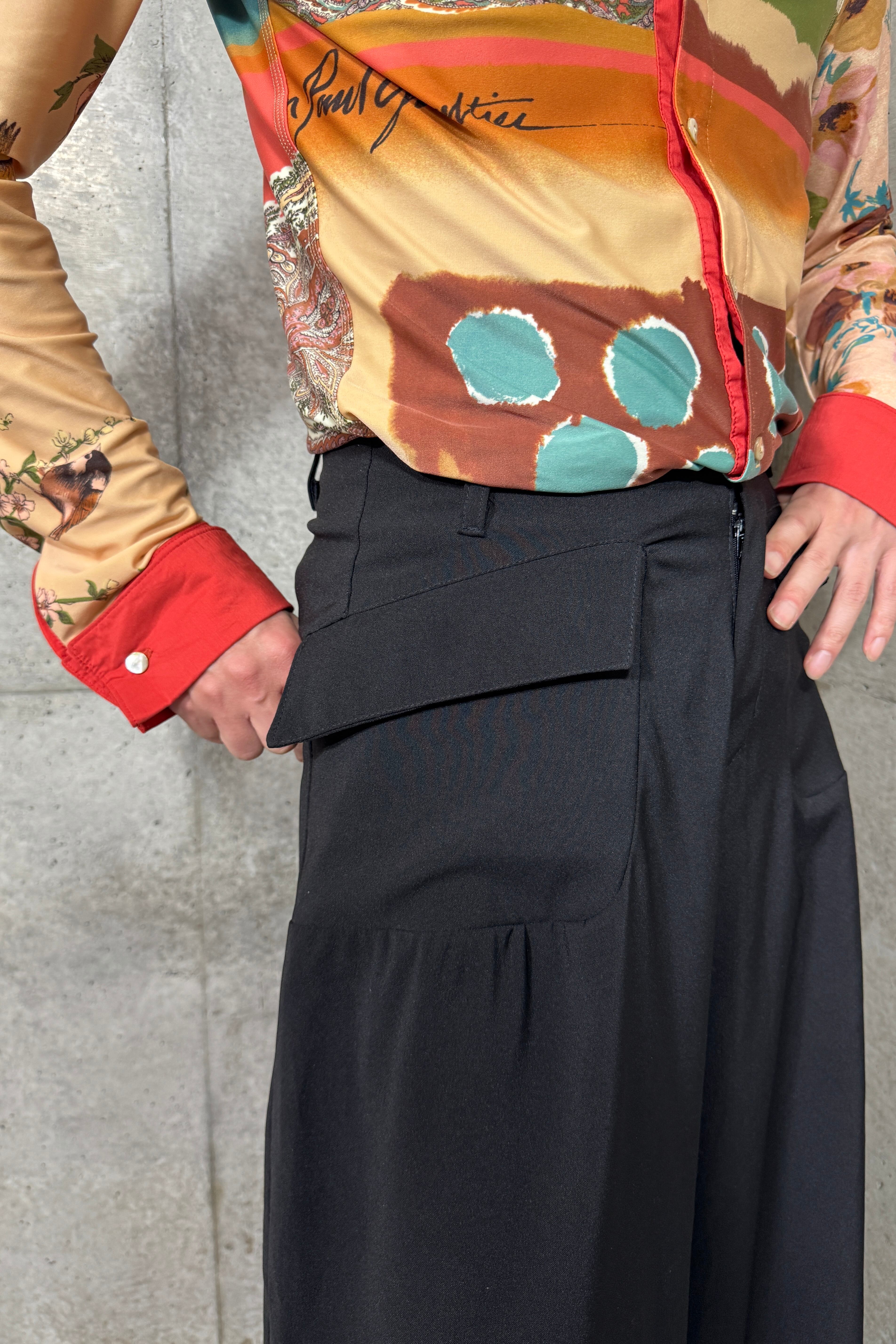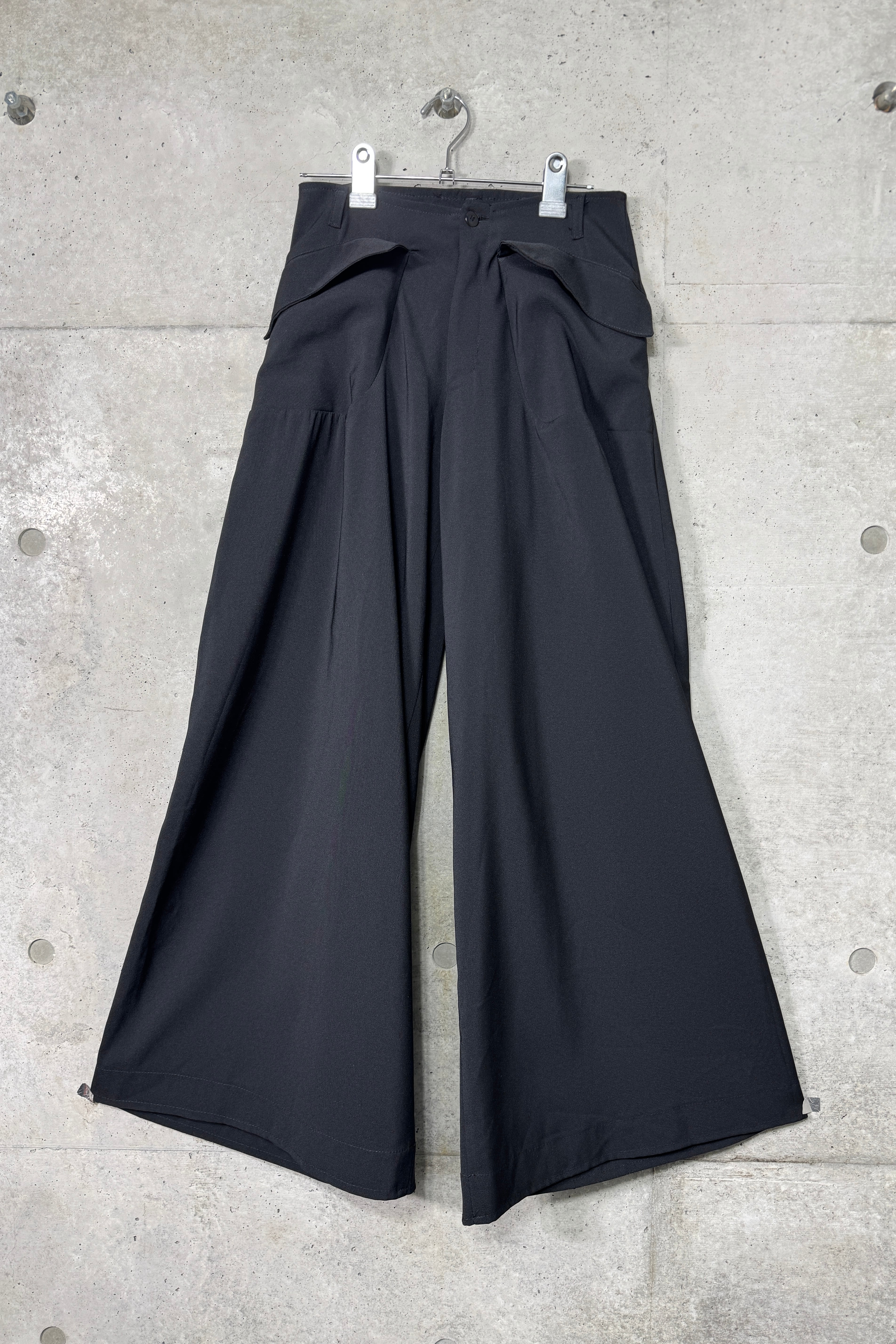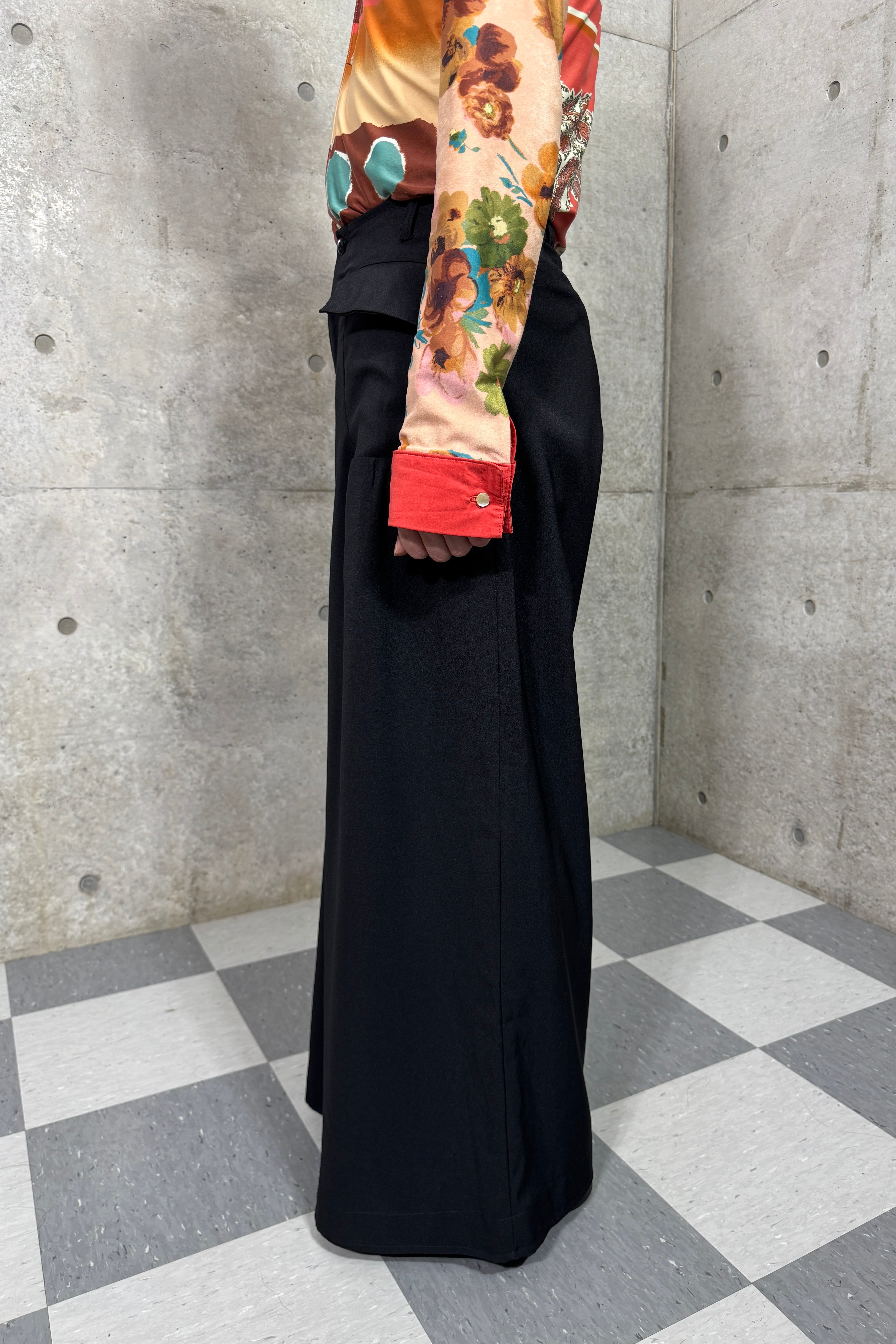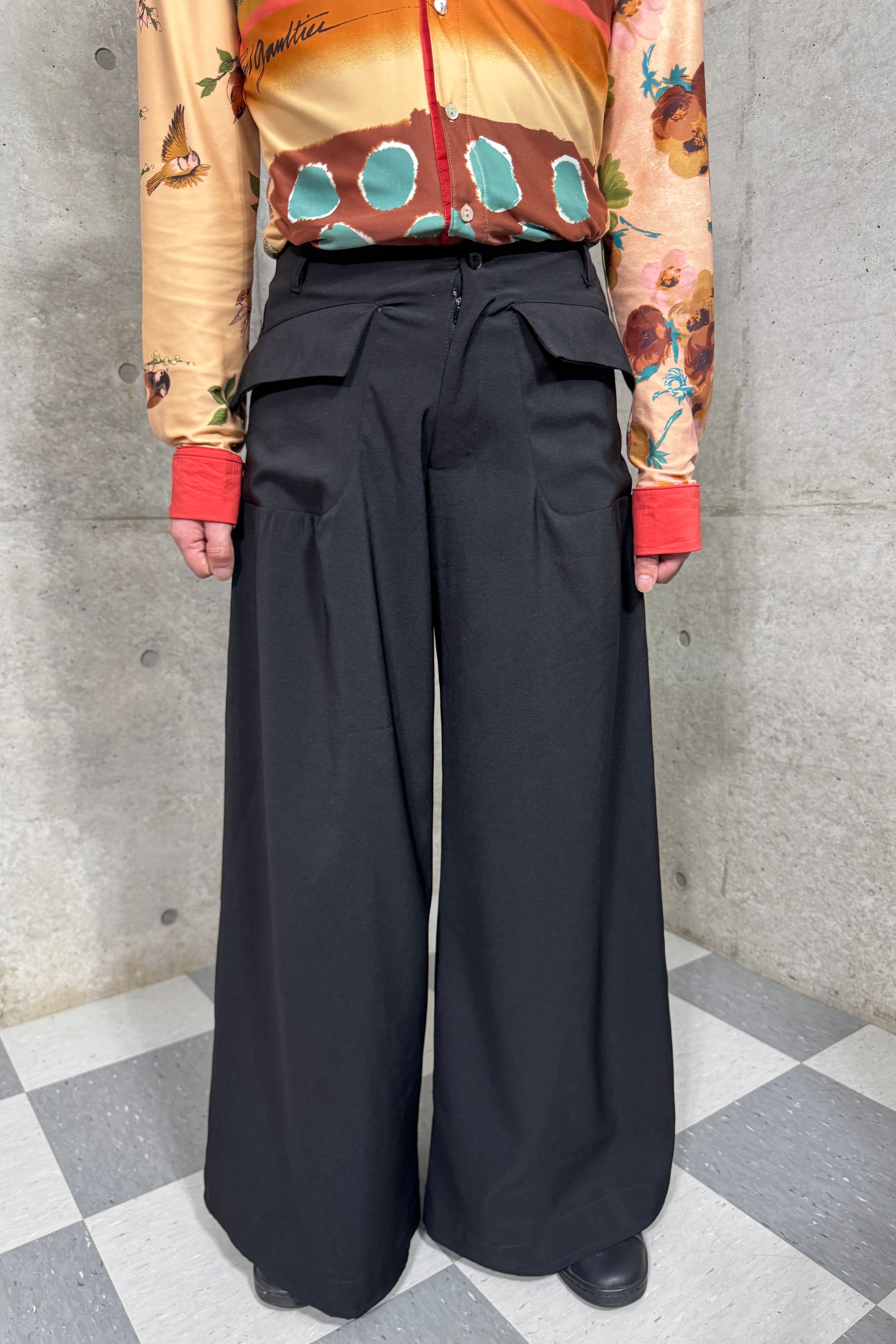 探すと全くないシューズが隠れるぐらいの太さの裾、着用するとドレープが生まれる面白いデザイン。