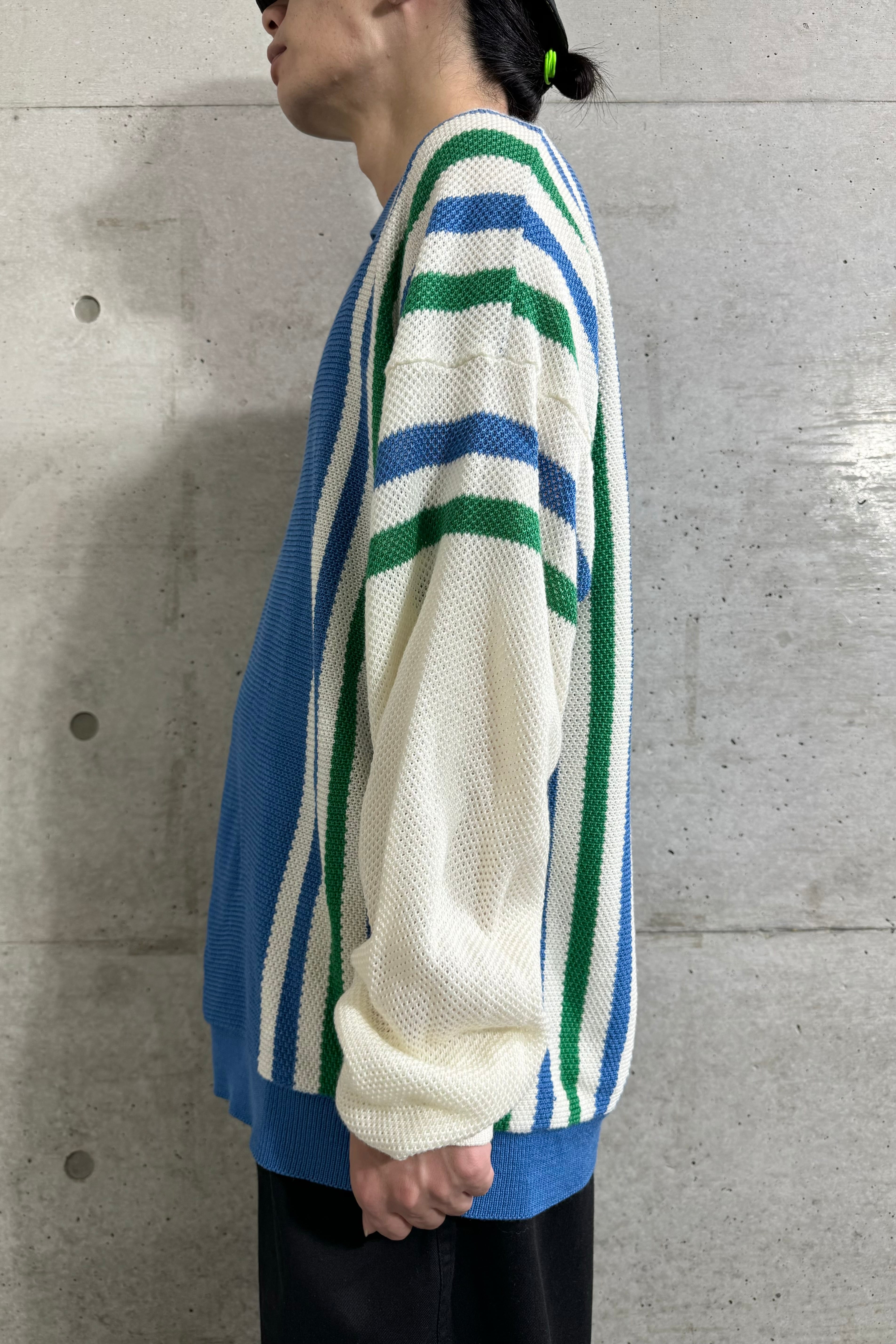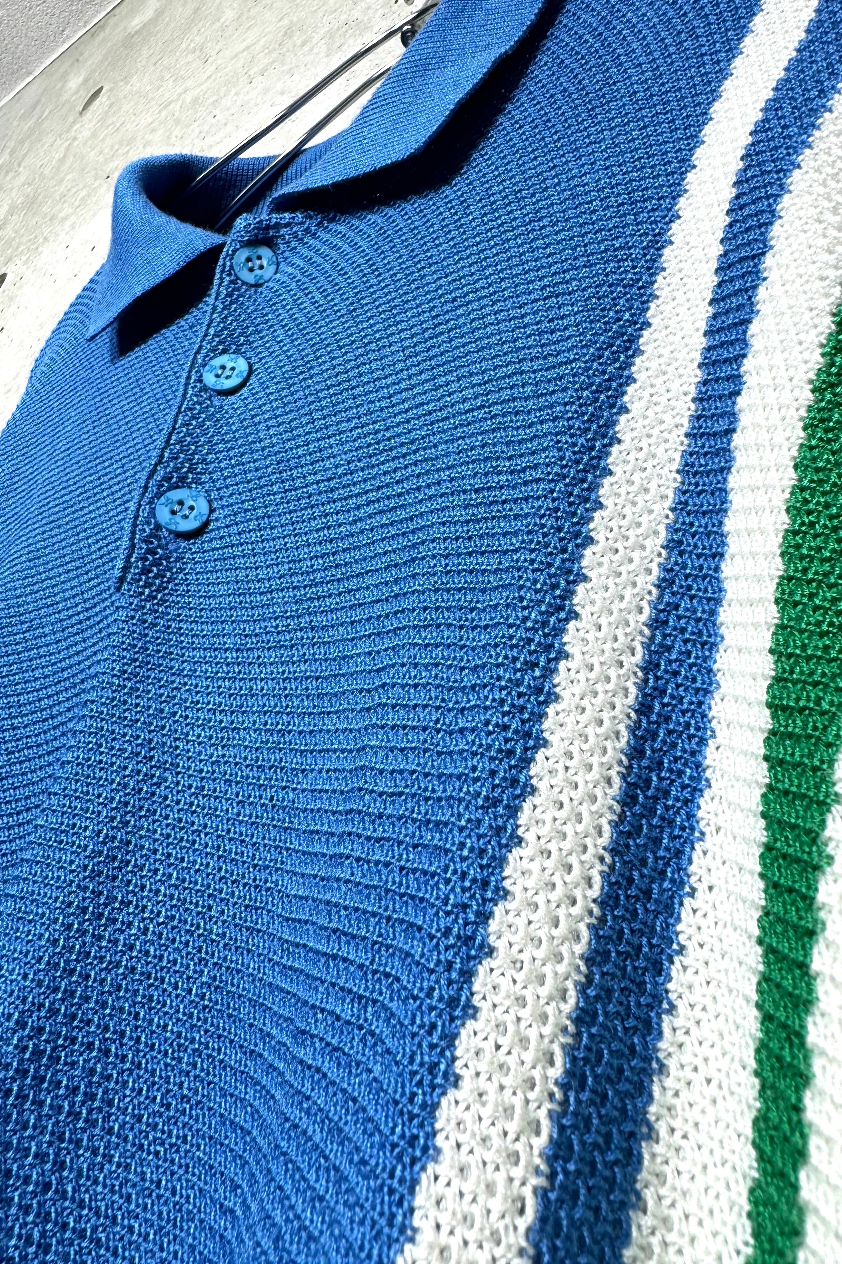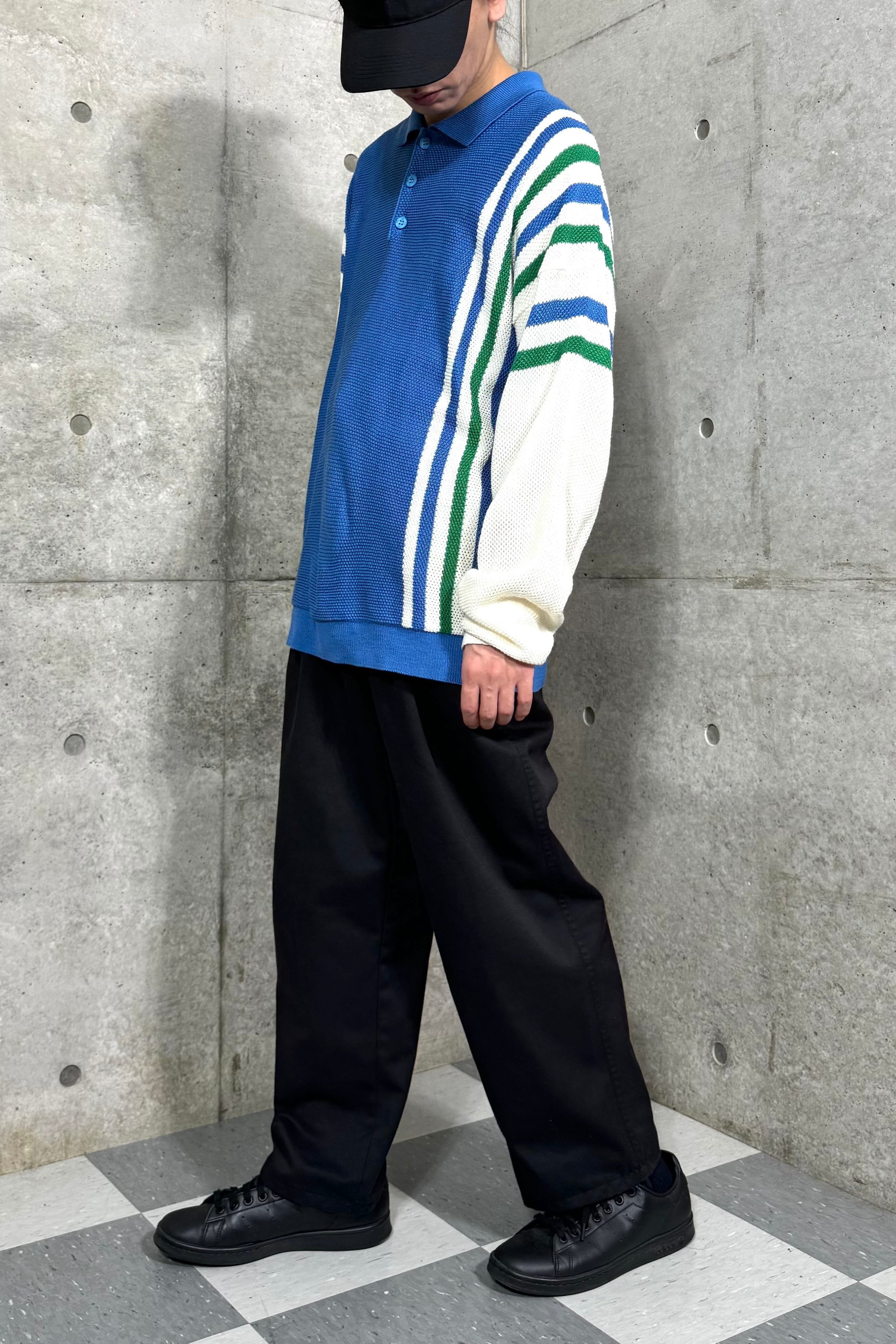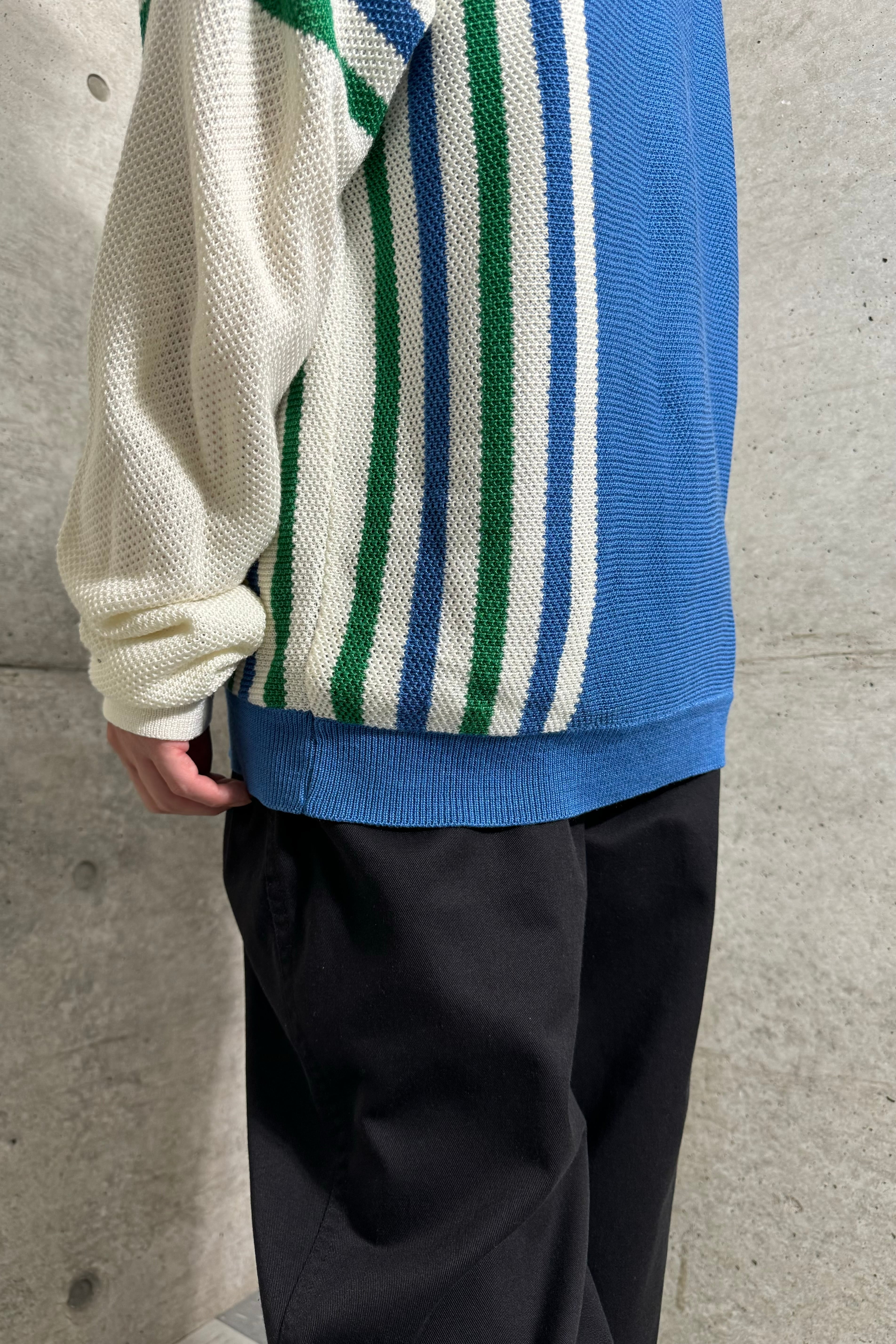 配色のバランスが本当に素晴らしい。シンプルなニットポロの中でも特にこだわりたい部分。どこかスポーティーな印象もあり、パンツを選ばず合わせられる1着。