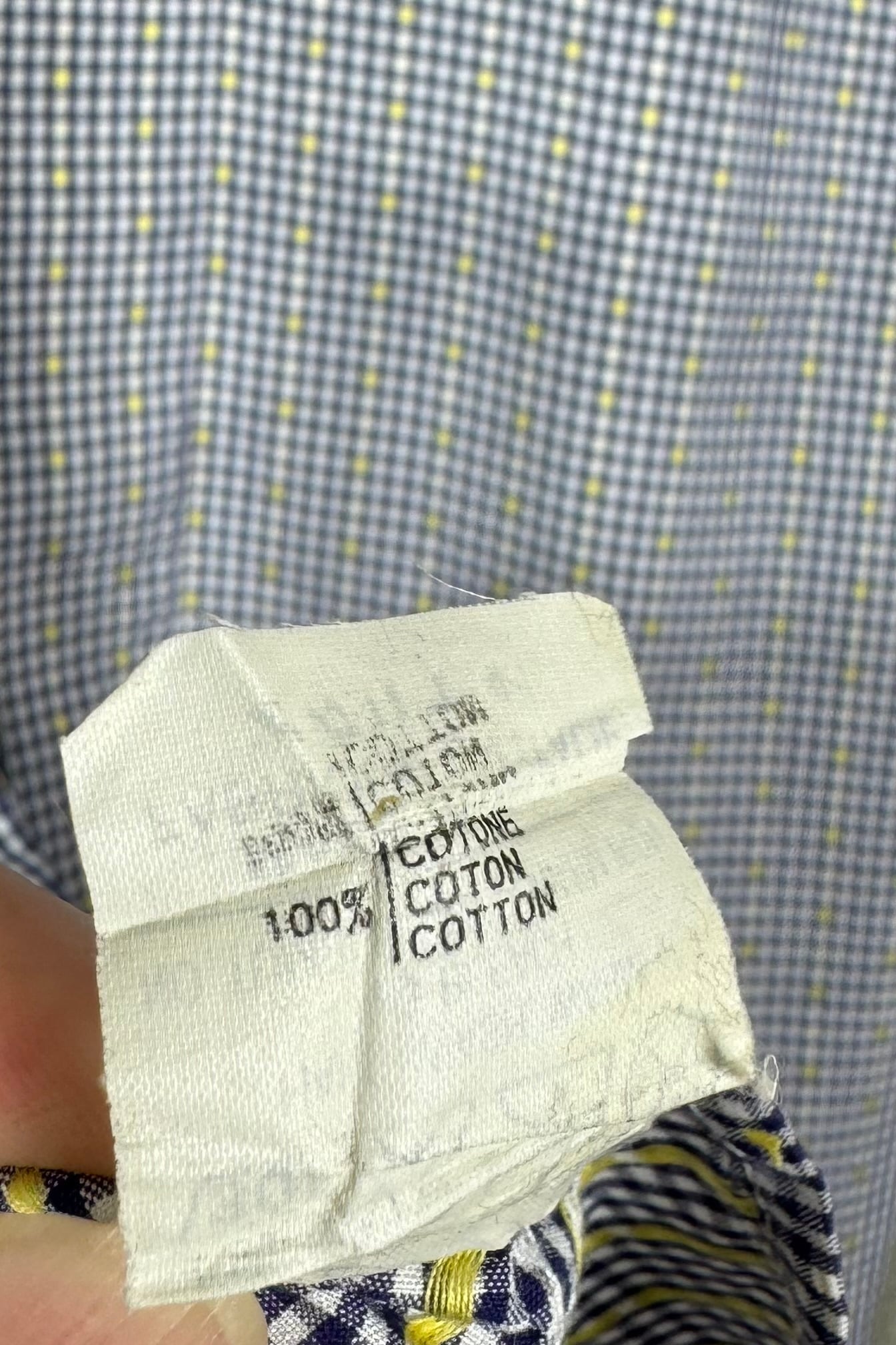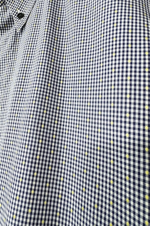 細かなチェック柄に入った小さなドット柄、ボタンダウンのかっちりとしたシャツの中に遊び心が入ったデザイン。