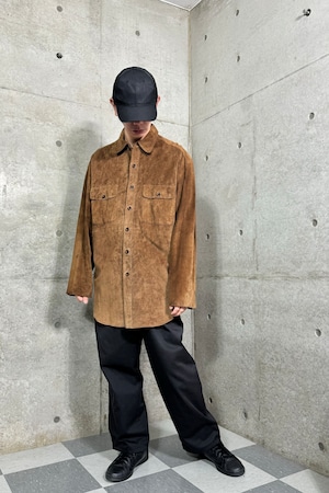 ゆったりとしたサイズ感におそらく前所有者が袖を切った切りっぱなしのデザイン、シャツと言うよりもブルゾンに近くインナーにニット•スウェットも着ることが出来ます。